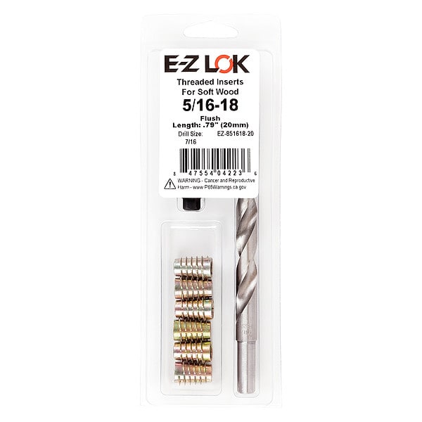 Thread Repair Kit, Number of Inserts 6, Number of Pieces 8, Insert Diameter 5/16 in, Insert Length 51/64 in, Thread Direction Right Hand, Thread Type Coarse, Insert Material Zinc, Material Grade/Class Not Applicable, Compatible Material Wood, Drill Bit Sizes Included 7/16 in, Maximum Hole Diameter 0.438 in, System of Measurement Inch, Includes (6) Flush 5/16-18 Inserts, 7/16 Brad Point Drill, Installation Tool, Number of Sizes 1, Tap Sizes Included Not Applicable