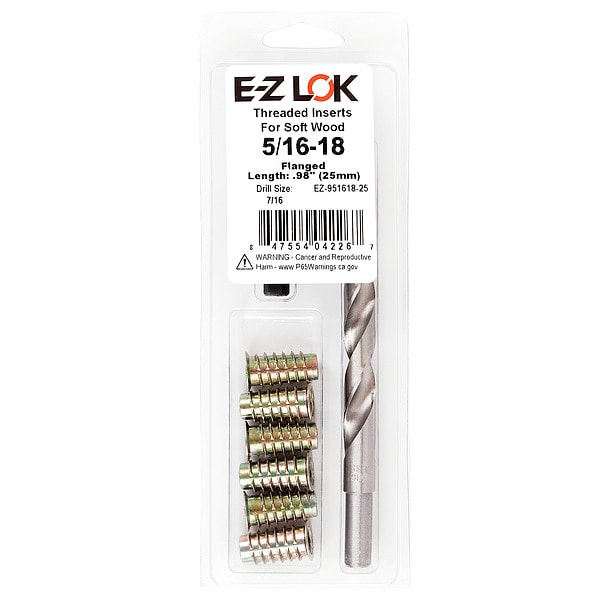 Thread Repair Kit, Number of Inserts 6, Number of Pieces 8, Insert Diameter 5/16 in, Insert Length 63/64 in, Thread Direction Right Hand, Thread Type Coarse, Insert Material Zinc, Material Grade/Class Not Applicable, Compatible Material Wood, Drill Bit Sizes Included 7/16 in, Maximum Hole Diameter 0.438 in, System of Measurement Inch, Includes (6) Flanged 5/16-18 Inserts, 7/16 Brad Point Drill, Installation Tool, Number of Sizes 1, Tap Sizes Included Not Applicable