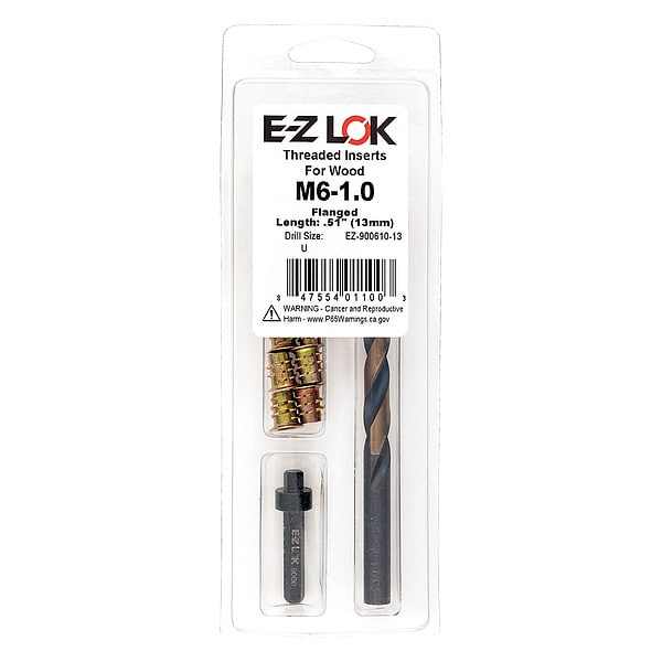 Thread Repair Kit, Number of Inserts 10, Number of Pieces 12, Insert Diameter 6 mm, Insert Length 12.954 mm, Thread Direction Right Hand, Thread Type Coarse, Insert Material Zinc, Material Grade/Class Not Applicable, Compatible Material Wood, Drill Bit Sizes Included 23/64 in, Maximum Hole Diameter 9.119 mm, System of Measurement Metric, Includes (10) Flanged M6-1.0 Inserts, Installation Tool, Letter U Drill, Number of Sizes 1, Tap Sizes Included Not Applicable, Thread Pitch 1 mm