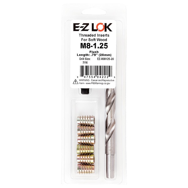Thread Repair Kit, Number of Inserts 6, Number of Pieces 8, Insert Diameter 8 mm, Insert Length 20.066 mm, Thread Direction Right Hand, Thread Type Coarse, Insert Material Zinc, Material Grade/Class Not Applicable, Compatible Material Wood, Drill Bit Sizes Included 7/16 in, Maximum Hole Diameter 11.125 mm, System of Measurement Metric, Includes (6) Flush M8-1.25 Inserts, 7/16 Brad Point Drill, Installation Tool, Number of Sizes 1, Tap Sizes Included Not Applicable, Thread Pitch 1.25 mm