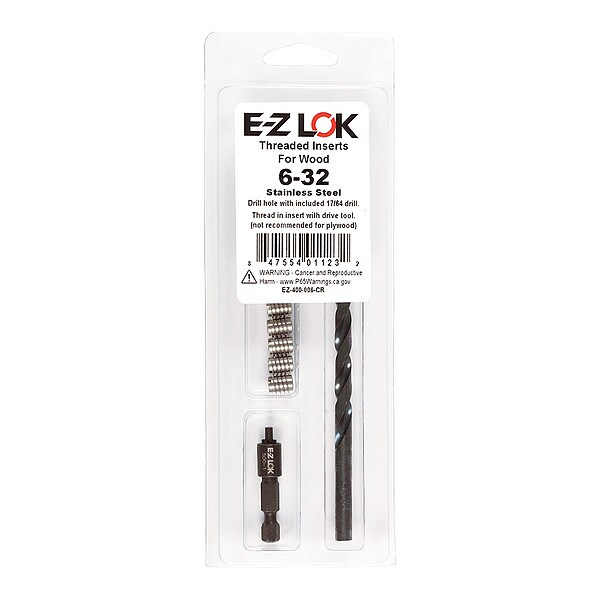 Knife Thread Insert, System of Measurement Inch, Insert Diameter 1/4 in, Overall Length 3/8 in, Internal Thread Size #6-32, Thread Direction Right Hand, Thread Type Coarse, Material Stainless Steel, Material Grade/Class 18-8, Finish Plain, Drive Type Slotted, Drill Bit Size 17/64 in, Compatible Material Wood, Minimum Material Thickness 13/32 in, Maximum Hole Diameter 0.266 in, Compatible with Manufacturer Model Number 500-006, Includes (10) Threaded Inserts, Drill, Drive Tool