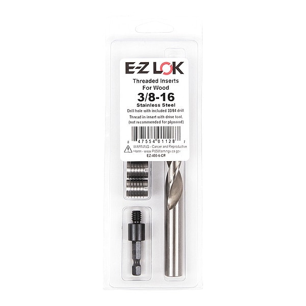 Knife Thread Insert, System of Measurement Inch, Insert Diameter 1/2 in, Overall Length 5/8 in, Internal Thread Size 3/8 In.-16, Thread Direction Right Hand, Thread Type Coarse, Material Stainless Steel, Material Grade/Class 18-8, Finish Plain, Drive Type Slotted, Drill Bit Size 33/64 in, Compatible Material Wood, Minimum Material Thickness 25/32 in, Maximum Hole Diameter 0.516 in, Compatible Manufacturer Model Number DT-6, Includes (5) Threaded Inserts, Drill, Drive Tool