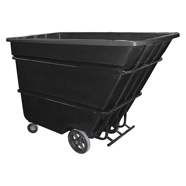 Tilt Truck, Cubic Foot Capacity 50 cu ft, Load Capacity 2,200 lb, Overall Length 74 in, Overall Width 40 in, Overall LxWxH 74 in x 40 in x 53 1/2 in, Overall Height 53 1/2 in, Optional Lid Mfg. Model No. 1.7 Lid, Container Material Polyethylene, Color Black, Handle Type Raised, Mobility Option Manual, Caster/Wheel Configuration (2) Axle-Mounted, (2) Swivel, Caster/Wheel Mounting Location Standard, Caster Wheel Type Standard, Caster Wheel/Tread Material Rubber, Caster Wheel Dia. 6 in
