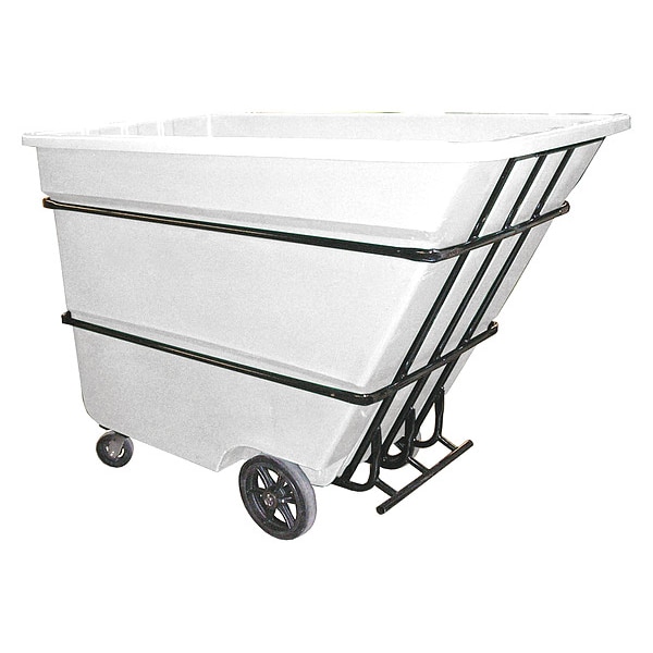 Plastic Tilt Truck, Cubic Foot Capacity 50 cu ft, Load Capacity 2,200 lb, Overall Length 74 in, Overall Width 40 in, Overall LxWxH 74 in x 40 in x 53 1/2 in, Overall Height 53 1/2 in, Optional Lid Mfg. Model No. 1.7 Lid, Container Material Polyethylene, Color White, Handle Type Raised, Mobility Option Manual, Caster/Wheel Configuration (2) Axle-Mounted, (2) Swivel, Caster/Wheel Mounting Location Standard, Caster Wheel Type Standard, Caster Wheel/Tread Material Rubber, Caster Wheel Dia. 6 in