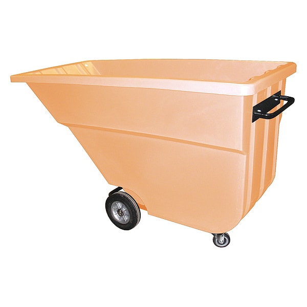 General Purpose Plastic Tilt Truck, Cubic Foot Capacity 29 cu ft, Load Capacity 900 lb, Overall Length 69 in, Overall Width 31 1/2 in, Overall LxWxH 69 in x 31 1/2 in x 39 1/2 in, Overall Height 39 1/2 in, Optional Lid Mfg. Model No. 1.1 Lid, Container Material Polyethylene, Color Orange, Handle Type Raised, Mobility Option Manual, Caster/Wheel Configuration (2) Axle-Mounted, (2) Swivel, Caster/Wheel Mounting Location Standard, Caster Wheel Type Standard, Caster Wheel/Tread Material Polyurethane