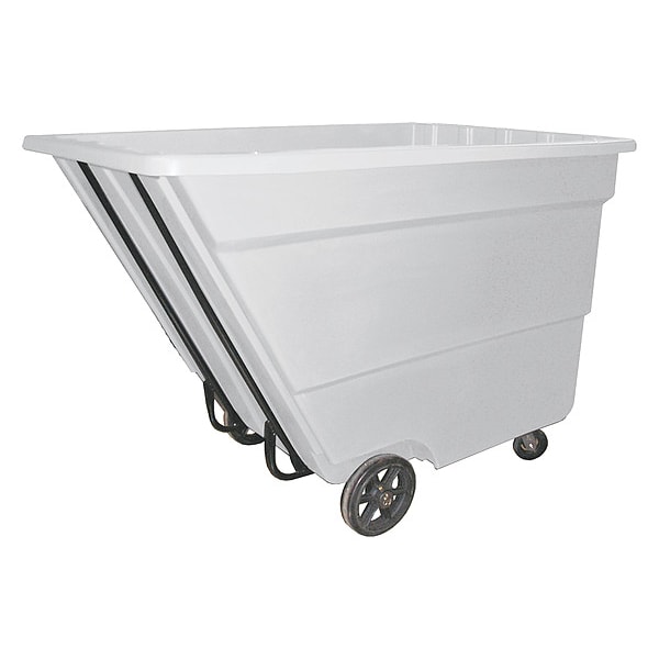 General Purpose Plastic Tilt Truck, Cubic Foot Capacity 59 cu ft, Load Capacity 2,000 lb, Overall Length 74 in, Overall Width 51 in, Overall LxWxH 74 in x 51 in x 53 1/2 in, Overall Height 53 1/2 in, Optional Lid Mfg. Model No. 2.2 Lid, Container Material Polyethylene, Color White, Handle Type Raised, Mobility Option Manual, Caster/Wheel Configuration (2) Axle-Mounted, (2) Swivel, Caster/Wheel Mounting Location Standard, Caster Wheel Type Standard, Caster Wheel/Tread Material Rubber