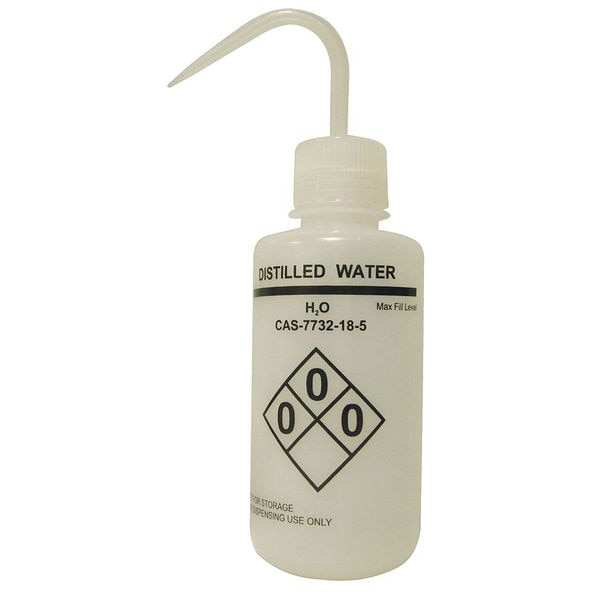 Wash Bottle, Capacity - Metric 500 mL, Imprinting Distilled Water, Capacity - English 16 fl oz, Basic Material Plastic, Body Material LDPE, Vented/Nonvented Vented, Closure Material Polypropylene, Spout Style Standard Spout, Product Type Wash Bottle, Body Color White, Body Diameter 75 mm, Closure Color Natural, Autoclavable No, Closure Included Yes, Mouth Size Narrow, Clarity Translucent, Numbers of Bottles Included 6, Standards Not Applicable, Package Quantity 6