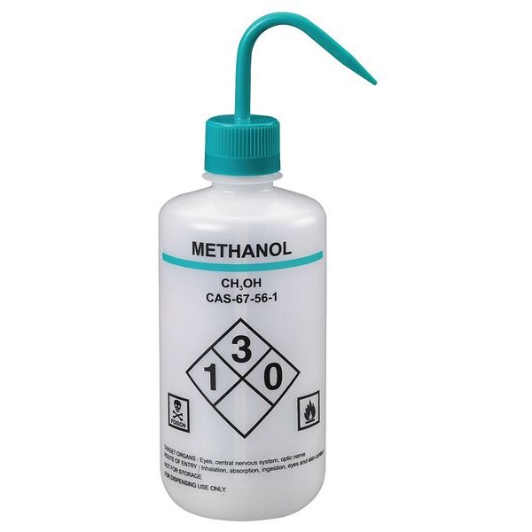 Wash Bottle, Capacity - Metric 1 L, Imprinting Methanol, Capacity - English 32 fl oz, Basic Material Plastic, Body Material LDPE, Vented/Nonvented Vented, Closure Material Polypropylene, Spout Style Standard Spout, Product Type Wash Bottle, Body Color White, Body Diameter 93.2 mm, Closure Color Green, Autoclavable No, Closure Included Yes, Mouth Size Narrow, Clarity Translucent, Numbers of Bottles Included 4, Standards Not Applicable, Package Quantity 4