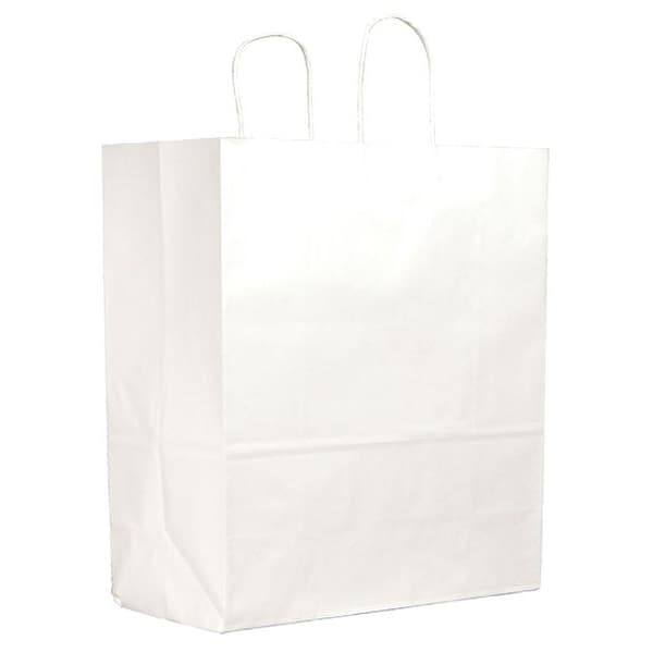 Bag Type Standard Merchandise Bag, Paper, Thickness Not Applicable, White, Handle Type Paper Twist, Message Not Applicable, Bag Bottom Type Flat, Shopping Bag, Package Configuration Bundle, Recycled Content Not Made From Recycled Content, FDA Compliant FDA Compliant, Width 13 in, Depth 6 in, Height 15 3/4 in, Package Quantity 250