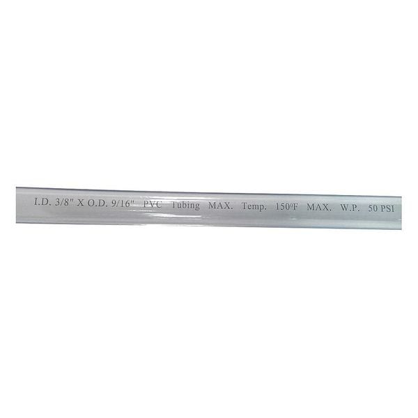Tubing, Application Air, Water, Color Clear, Hardness Shore A 73, Inside Diameter 3/8 in, Jacket Color No Jacket, Jacket Material No Jacket, Material PVC, Material Trade Name Not Applicable, Material Trade Number Not Applicable, Maximum Operating Pressure 50 psi @ 70 Degrees F, Maximum Operating Temperature 150 Degrees F, Outside Diameter 9/16 in, Overall Length 100 ft, Peristaltic Pump Compatible No, PEX Type Not Applicable
