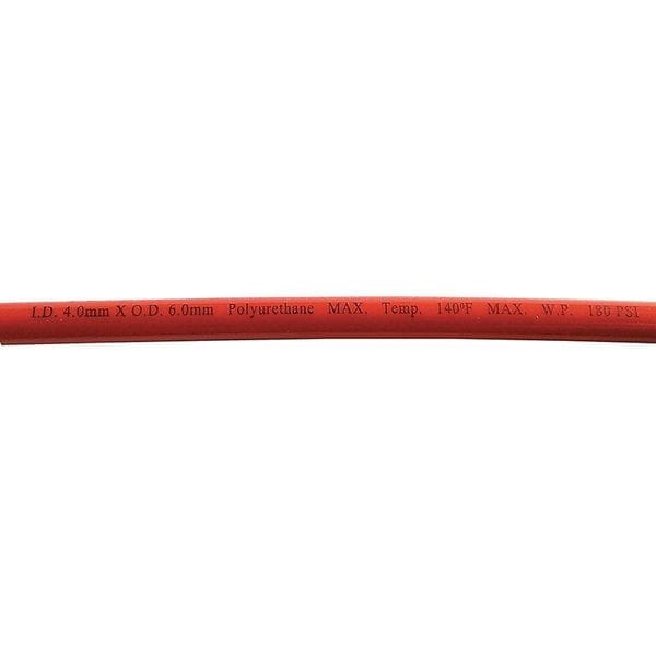 Tubing, Application Air, Water, Color Red, Hardness Shore A 98, Inside Diameter 4 mm, Jacket Color No Jacket, Jacket Material No Jacket, Material Polyurethane, Material Trade Name Not Applicable, Material Trade Number Not Applicable, Maximum Operating Pressure 180 psi, Maximum Operating Temperature 140 Degrees F, Maximum Vacuum Pressure 28 in Hg, Outside Diameter 6 mm, Overall Length 100 ft, Peristaltic Pump Compatible No, PEX Type Not Applicable
