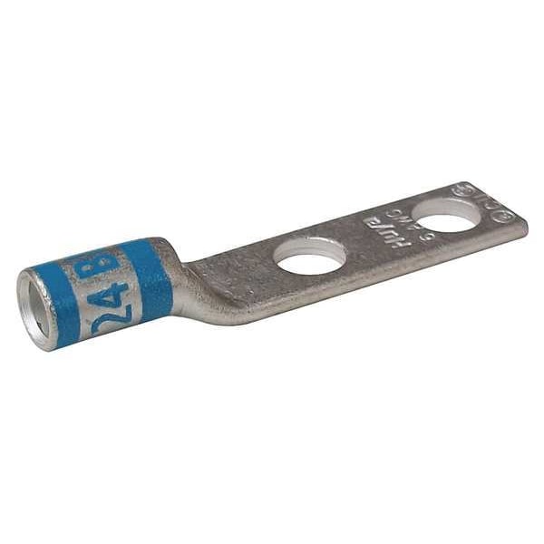 Two-Hole Lug Compression Connector, Barrel Size Short, Color Code Blue, Die Code 24, Tongue Angle Straight, Tongue Width 0.44 in, For Conductor Material Copper, For Stud Size 1/4 in, For Stranded Copper Wire Size - Minimum 6 AWG, For Stranded Copper Wire Size - Maximum 6 AWG, Inspection Hole Yes, Hole Center to Center 0.625 in, Material Copper, Maximum Operating Temperature 300 Degrees F, Maximum Voltage 600 V AC, Termination Style Crimp, Seam Style Seamless, Standards UL Listed