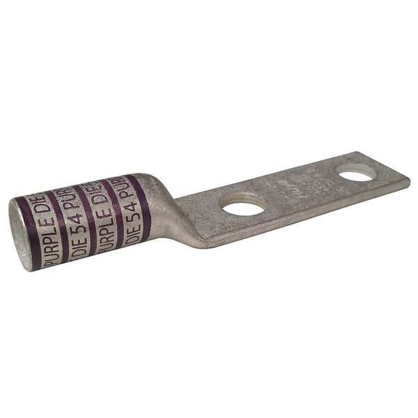 Two-Hole Lug Compression Connector, Barrel Size Long, Color Code Purple, Die Code 54, Tongue Angle Straight, Tongue Width 1.03 in, For Conductor Material Copper, For Stud Size 1/4 in, For Stranded Copper Wire Size - Minimum 4/0 AWG, For Stranded Copper Wire Size - Maximum 4/0 AWG, Inspection Hole No, Hole Center to Center 0.75 in, Material Copper, Maximum Operating Temperature 300 Degrees F, Maximum Voltage 600 V AC, Termination Style Crimp, Seam Style Seamless