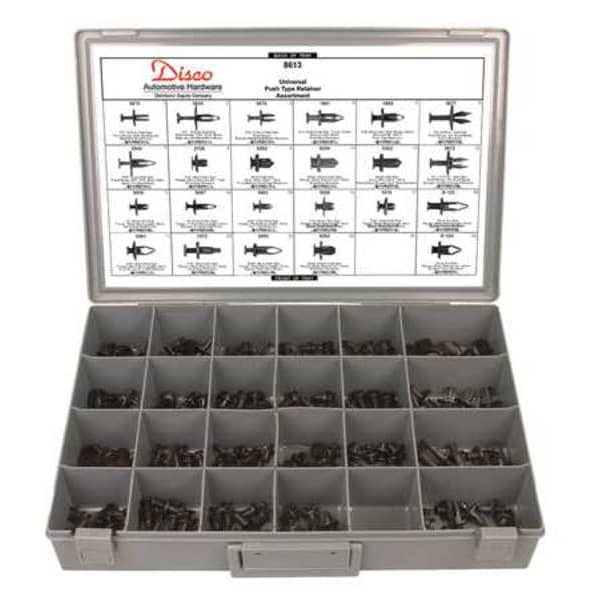 Universal Shield Retainer Assortment, Number of Pieces 204, Number of Sizes 23, Product Type Push-In Rivet Assortment, Material Grade/Class Ungraded, Manufacturer Location Globally Sourced, Made in North America No