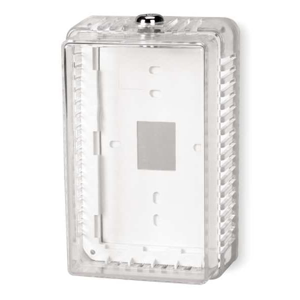 Universal Thermostat Guard, Base Type Ring Base, Solid Base, Cover Type Snap-On, Guard Construction Single Wall, Inside Depth 3 in, Inside Height 6 13/16 in, Inside Width 4 in, Material Plastic, Mounting Direction Horizontal or Vertical, Outside Depth 3 3/8 in, Outside Height 8 in, Outside Width 5 in, Thermostat Guard Cover Color Clear, Finish Cover Clear, Base and Ring Off-White, Includes Mounting Hardware, Includes Baseplate Yes, Number of Keys 2, Replacement Keys Grainger Part Number 26DJ03