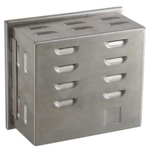 Universal Thermostat Guard, Base Type Ring Base, Solid Base, Cover Type Hinged, Guard Construction Single Wall, Inside Depth 2 1/2 in, Inside Height 4 5/8 in, Inside Width 5 1/4 in, Material Stainless Steel, Mounting Direction Horizontal or Vertical, Outside Depth 2 11/16 in, Outside Height 5 3/16 in, Outside Width 5 13/16 in, Thermostat Guard Cover Color Silver, Base Gauge 36 ga, Cover Gauge 36 ga, Includes Mounting Hardware, Includes Baseplate Yes, Number of Keys 2