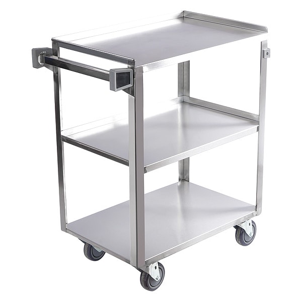 Utility Cart, Load Capacity 300 lb, Stainless Steel Material, 22 ga Gauge, Polished Finish, Silver Color, Overall Length 31 in, Overall Width 18 in, Number of Shelves 3, Capacity per Shelf 100 lb, Distance Between Shelves 13 in, Shelf Length 28 in, Shelf Width 18 in, Distance Between Middle and Bottom Shelf 13 in, Distance Between Top and Middle Shelf 13 in, Top Shelf Height 32 in, Assembled/Unassembled Assembled