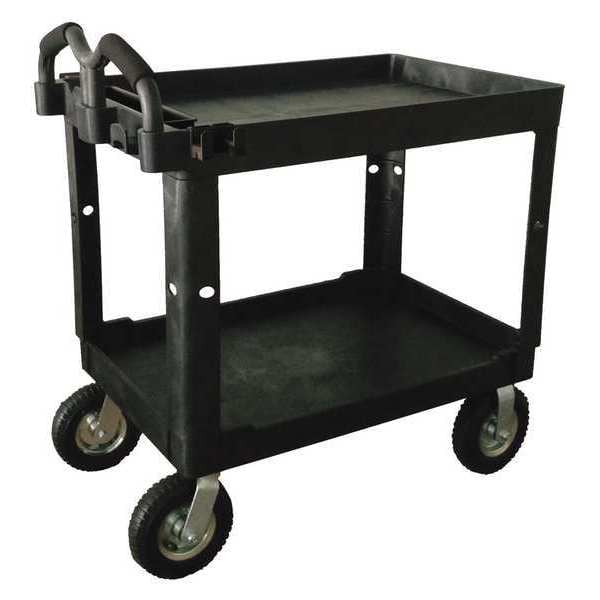 Utility Cart with Deep Lipped & Flush Plastic Shelves, Number of Shelves 2, Lip Style Combination, Load Capacity 500 lb, Shelf Length 38 1/8 in, Shelf Width 24 1/4 in, Top Shelf Height 36 in, Distance Between Shelves 20 1/8 in, Handle Type Ergonomic, Handle Height 5 35/64 in, Caster Wheel/Tread Material Rubber, Caster Wheel Dia. 9 in, Lip Height 2 23/64 in
