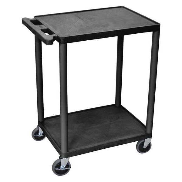 Utility Cart, Number of Shelves 2, Lip Style 4-Sided Lipped, Load Capacity 300 lb, Shelf Length 24 in, Shelf Width 18 in, Top Shelf Height 34 in, Distance Between Shelves 26 in, Handle Type Flat, Handle Height 33 in, Caster Brake Type Side Pedal Brake, Caster Wheel/Tread Material Thermoplastic Rubber, Caster Wheel Dia. 4 in, Caster/Wheel Configuration (2) Swivel, (2) Swivel with Brake, Cleanroom No, Lip Height 1/4 in