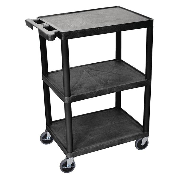 Utility Cart, Number of Shelves 3, Lip Style 4-Sided Lipped, Load Capacity 300 lb, Shelf Length 24 in, Shelf Width 18 in, Top Shelf Height 34 in, Distance Between Shelves 12 in, Distance Between Top and Middle Shelf 12 in, Distance Between Middle and Bottom Shelf 12 in, Handle Type Flat, Handle Height 34 in, Caster Brake Type Side Pedal Brake, Caster Wheel/Tread Material Thermoplastic Rubber, Caster Wheel Dia. 4 in, Caster/Wheel Configuration (2) Swivel, (2) Swivel with Brake, Cleanroom No