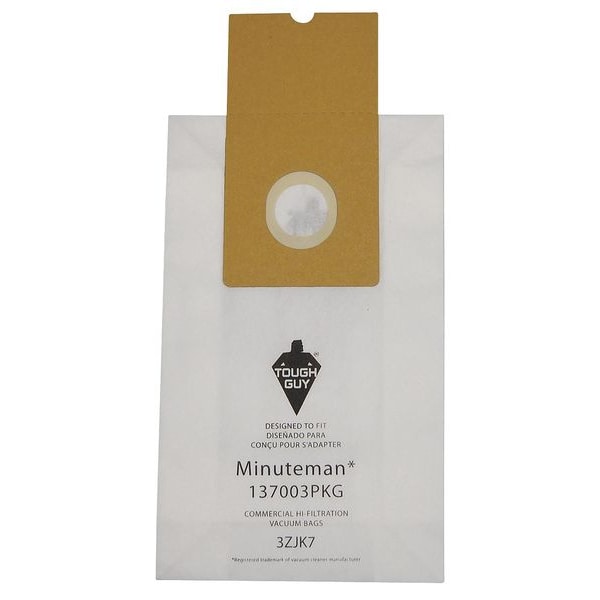 Vacuum Bag, For Vacuum Type Upright Vacuum, Fits Vacuum Brand Minuteman, Fits Vacuum Models 137003, Bag Filtration Type Standard, Filter Efficiency Up to 99 Percent at 0.3 microns, Bag Material Paper, Ply Count 2-Ply, Bag Pickup Type Dry, Bag Reusability Disposable, Height 1/2 in, Length 11 3/4 in, Width/Diameter 7 in, Package Quantity 10