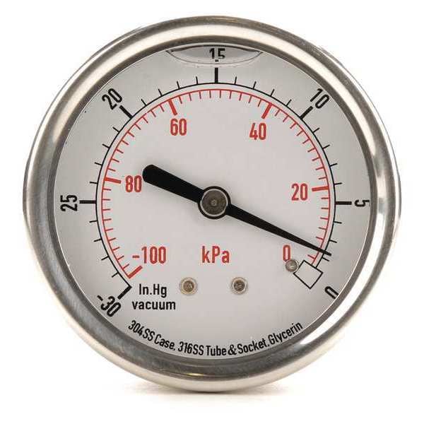 Commercial Vacuum Gauge, Nominal Dial Size 2 1/2 in, Accuracy +/-3-2-3 Percent, Gauge Case Material 304 Stainless Steel, Process Connection Type NPT, Process Connection Gender Male, Lens Material Acrylic, Process Connection Size 1/4 in, Field Fillable No, Process Connection Location Center Back, Case Color Silver, IP/NEMA Rating Not Rated, Primary Pressure Range 30 to 0, Dry Dampening Feature None, Vibration Resistance Liquid-Filled, Dial Color White