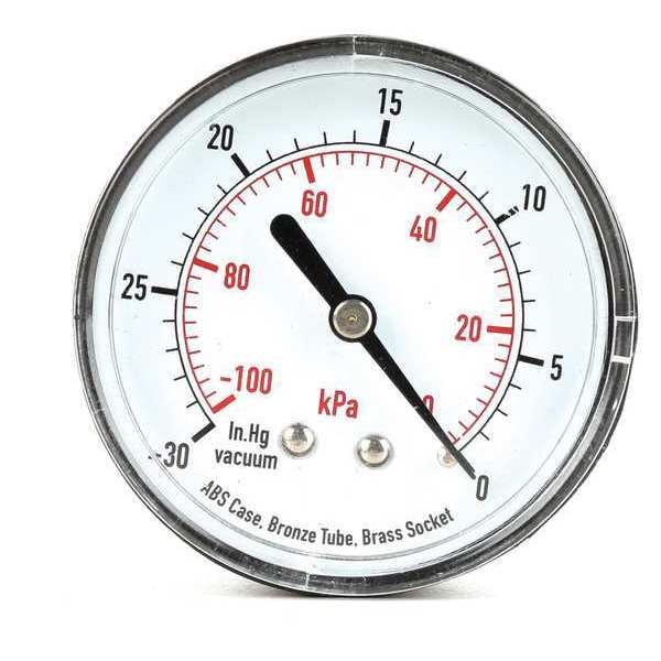 Commercial Vacuum Gauge, Accuracy +/-3-2-3 Percent, Gauge Case Material ABS Plastic, Nominal Dial Size 2 1/2 in, Lens Material Acrylic, IP/NEMA Rating Not Rated, Hazardous Location Rating Not Rated, Sensor Material Bronze, Socket Material Brass, Process Connection Type NPT, Process Connection Gender Male, Process Connection Location Center Back, Process Connection Size 1/4 in, Panel-Mountable No, Pressure Gauge Type General Purpose Dial Pressure Gauge