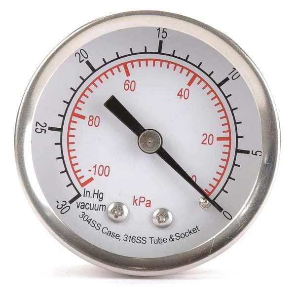 Commercial Vacuum Gauge, Accuracy +/-3-2-3 Percent, Gauge Case Material 304 Stainless Steel, Nominal Dial Size 2 in, Lens Material Acrylic, IP/NEMA Rating Not Rated, Hazardous Location Rating Not Rated, Sensor Material 316 Stainless Steel, Socket Material 316 Stainless Steel, Process Connection Type NPT, Process Connection Gender Male, Process Connection Location Center Back, Process Connection Size 1/4 in, Panel-Mountable No, Pressure Gauge Type General Purpose Dial Pressure Gauge