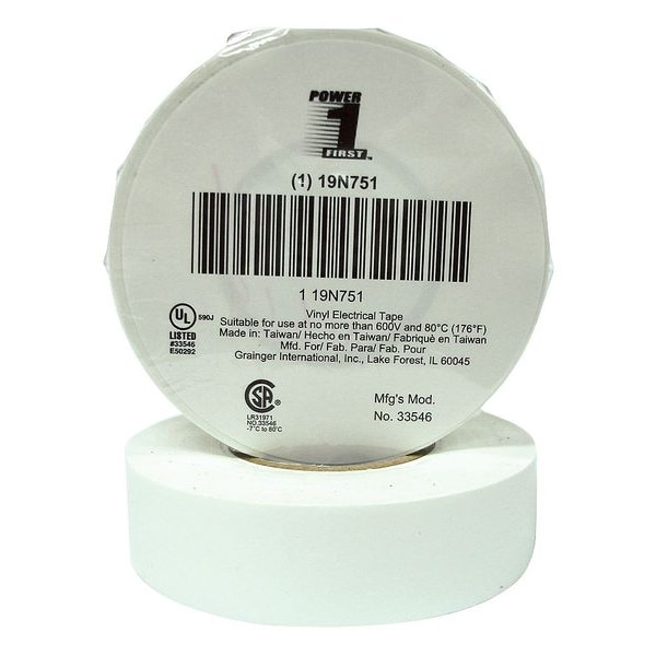 Electrical Tape, General Purpose, Vinyl, Tape Adhesive Material Rubber, 3/4 in, 20 yd, 7 mil, Approved Vendor, Series Economy, White, Minimum Tape Performance Temperature 20 Degrees F, Maximum Tape Performance Temperature 175 Degrees F, Voltage Rating 600 V, Continuous Roll, Single-Sided