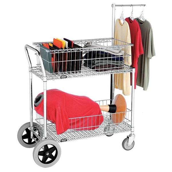 Utility Cart with High-Volume Removable Wire Basket Shelves, Load Capacity 300 lb, Number of Shelves 2, Shelf Width 18 in, Shelf Length 41 in, Material Steel, Finish Chrome, Caster Wheel Dia. 5 in, Color Silver, Caster Brake Type No Brake Included, Caster Wheel/Tread Material Polyurethane, Caster/Wheel Configuration (2) Rigid, (2) Swivel, Handle Type (2) Raised, Lip Style 4-Sided Lipped, Collapsible No, Overall Height 41 in, Overall Length 36 in, Overall Width 18 in