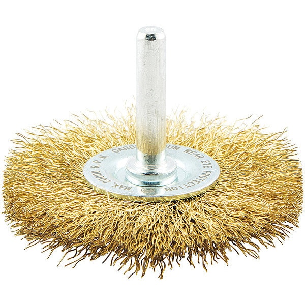 Wire Wheel Brush, Bristle Type Crimped Wire, Product Type Wire Wheel Brush, Bristle Material Brass, Brush Dia. 2 1/2 in, Grit Not Applicable, Face Width 3/8 in, Bristle Diameter 0.008 in, Bristle Length 1/2 in, Compatible Tool Type Die Grinder, Drill Press, Pencil Grinder, Straight Grinder, Connector Type Round Shank, Connector Size 1/4 in, Operating Speed - Maximum 20,000 RPM, Color Not Applicable