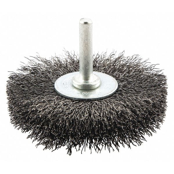 Wire Wheel Brush, Bristle Type Crimped Wire, Product Type Wire Wheel Brush, Bristle Material Carbon Steel, Brush Dia. 3 in, Grit Not Applicable, Face Width 1/2 in, Bristle Diameter 0.008 in, Bristle Length 1 in, Compatible Tool Type Die Grinder, Pencil Grinder, Connector Type Round Shank, Connector Size 1/4 in, Operating Speed - Maximum 20,000 RPM, Color Not Applicable