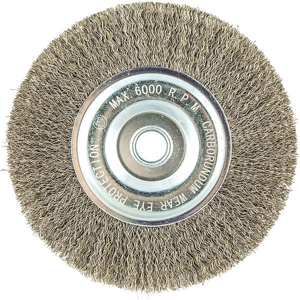 Wire Wheel Brush, Bristle Type Crimped Wire, Product Type Wire Wheel Brush, Bristle Material Stainless Steel, Brush Dia. 6 in, Grit Not Applicable, Face Width 3/4 in, Bristle Diameter 0.012 in, Bristle Length 1 1/4 in, Compatible Tool Type Bench Grinder, Pedestal Grinder, Angle Grinder, Connector Type Threaded Hole, Connector Size 5/8 in, Operating Speed - Maximum 6,000 RPM, Shank Length Not Applicable, Color Not Applicable