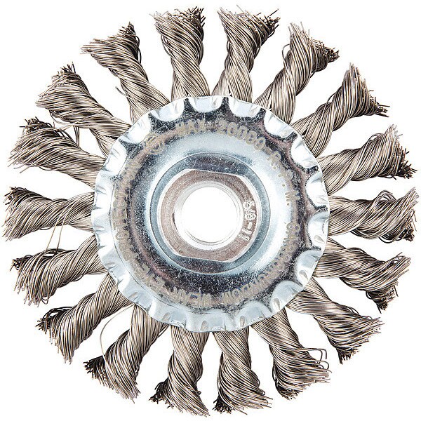 Wire Wheel Brush, Bristle Type Standard Twist Knot Wire, Product Type Wire Wheel Brush, Bristle Material Stainless Steel, Brush Dia. 4 in, Grit Not Applicable, Face Width 1/2 in, Bristle Diameter 0.014 in, Bristle Length 7/8 in, Compatible Tool Type Angle Grinder, Connector Type Threaded Hole, Connector Size 5/8 In.-11, Operating Speed - Maximum 20,000 RPM, Shank Length Not Applicable, Color Not Applicable