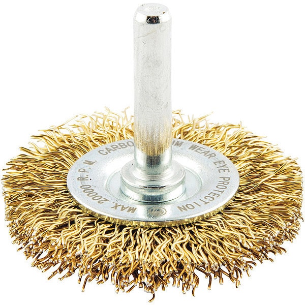Wire Wheel Brush, Bristle Type Crimped Wire, Product Type Wire Wheel Brush, Bristle Material Brass, Brush Dia. 2 in, Grit Not Applicable, Face Width 5/16 in, Bristle Diameter 0.014 in, Bristle Length 1/2 in, Compatible Tool Type Die Grinder, Drill Press, Pencil Grinder, Straight Grinder, Connector Type Round Shank, Connector Size 1/4 in, Operating Speed - Maximum 20,000 RPM, Color Not Applicable