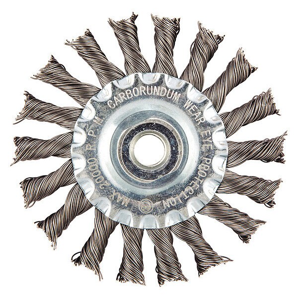 Wire Wheel Brush, Bristle Type Standard Twist Knot Wire, Product Type Wire Wheel Brush, Bristle Material Carbon Steel, Brush Dia. 4 in, Grit Not Applicable, Face Width 1/2 in, Bristle Diameter 0.02 in, Bristle Length 7/8 in, Compatible Tool Type Angle Grinder, Connector Type Threaded Hole, Connector Size 3/8 In.-24, Operating Speed - Maximum 20,000 RPM, Shank Length Not Applicable, Color Not Applicable
