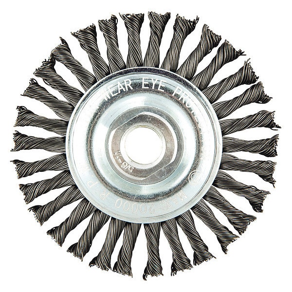 Wire Wheel Brush, Bristle Type Stringer Bead Twist Knot Wire, Product Type Wire Wheel Brush, Bristle Material Carbon Steel, Brush Dia. 4 in, Grit Not Applicable, Face Width 1/4 in, Bristle Diameter 0.02 in, Bristle Length 7/8 in, Compatible Tool Type Angle Grinder, Connector Type Threaded Hole, Connector Size 5/8 In.-11, Operating Speed - Maximum 20,000 RPM, Shank Length Not Applicable, Color Not Applicable, Series Gemini