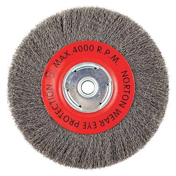 Wire Wheel Brush, Bristle Type Crimped Wire, Product Type Wire Wheel Brush, Bristle Material Carbon Steel, Brush Dia. 8 in, Grit Not Applicable, Face Width 1 in, Bristle Diameter 0.014 in, Bristle Length 1 9/16 in, Compatible Tool Type Bench Grinder, Pedestal Grinder, Connector Type Threaded Hole, Connector Size 5/8 in, Operating Speed - Maximum 4,000 RPM, Shank Length Not Applicable, Color Not Applicable, Series Gemini
