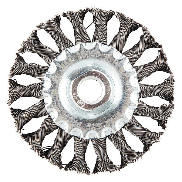 Wire Wheel Brush, Bristle Type Stringer Bead Twist Knot Wire, Product Type Wire Wheel Brush, Bristle Material Carbon Steel, Brush Dia. 4 in, Grit Not Applicable, Face Width 1/2 in, Bristle Diameter 0.02 in, Bristle Length 7/8 in, Compatible Tool Type Angle Grinder, Connector Type Threaded Hole, Connector Size 5/8 In.-11, Operating Speed - Maximum 20,000 RPM, Shank Length Not Applicable, Color Not Applicable, Series Gemini