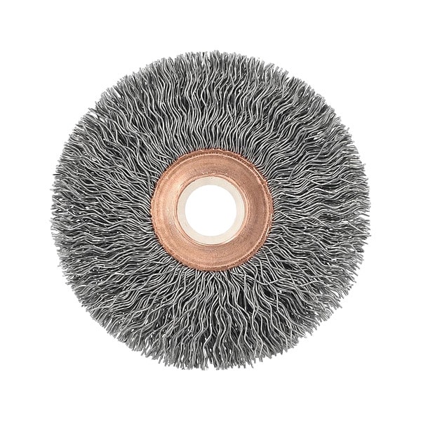 Wire Wheel Brush, Bristle Type Crimped Wire, Product Type Wire Wheel Brush, Bristle Material Carbon Steel, Brush Dia. 2 1/2 in, Grit Not Applicable, Face Width 1/2 in, Bristle Diameter 0.014 in, Bristle Length 3/4 in, Compatible Tool Type Die Grinder, Drill Press, Pencil Grinder, Primary Material Application Carbon Steel, Steel, Wood, Connector Type Unthreaded Hole, Connector Size 1/2 in to 3/8 in, Operating Speed - Maximum 20,000 RPM