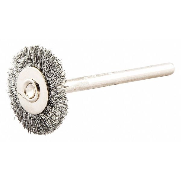 Wire Wheel Brush, Bristle Type Crimped Wire, Product Type Wire Wheel Brush, Bristle Material Brass, Brush Dia. 1 in, Grit Not Applicable, Face Width 1/8 in, Bristle Diameter 0.005 in, Bristle Length 5/16 in, Compatible Tool Type Die Grinder, Drill Press, Pencil Grinder, Straight Grinder, Connector Type Round Shank, Connector Size 1/8 in, Operating Speed - Maximum 37,000 RPM, Color Not Applicable, Series Gemini
