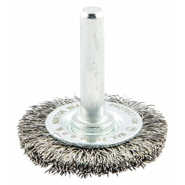 Wire Wheel Brush, Bristle Type Crimped Wire, Product Type Wire Wheel Brush, Bristle Material Carbon Steel, Brush Dia. 1 1/2 in, Grit Not Applicable, Face Width 1/4 in, Bristle Diameter 0.008 in, Bristle Length 1/4 in, Compatible Tool Type Die Grinder, Pencil Grinder, Straight Grinder, Connector Type Round Shank, Connector Size 1/4 in, Operating Speed - Maximum 25,000 RPM, Color Not Applicable, Series Gemini