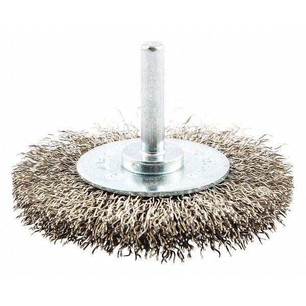 Wire Wheel Brush, Bristle Type Crimped Wire, Product Type Wire Wheel Brush, Bristle Material Stainless Steel, Brush Dia. 3 in, Grit Not Applicable, Face Width 7/16 in, Bristle Diameter 0.014 in, Bristle Length 3/4 in, Compatible Tool Type Die Grinder, Pencil Grinder, Straight Grinder, Connector Type Round Shank, Connector Size 1/4 in, Operating Speed - Maximum 25,000 RPM, Color Not Applicable, Series Gemini