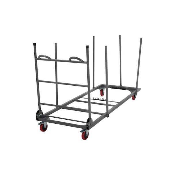 Zown commercial grade retangular table trolley. Solely distributed by Cosco. Comers with locking casters and a special handle to protect hands during use. Can hold 48", 72" and 96" length tables. Capacity is 20 tables. Easy to assemble. Grey color