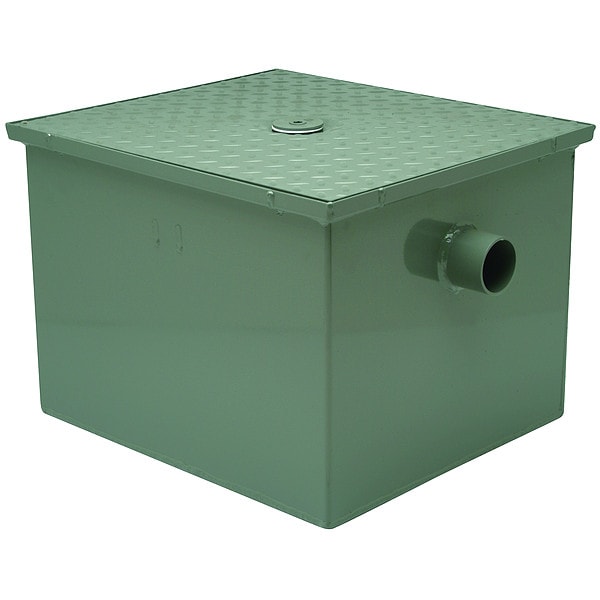Grease Interceptor, Outlet Connection Type No Hub, Application Grease, Overall Depth 11 3/4 in, Overall Width 14 in, Color Green, Features Silicon Odor Seal, Maximum Temperature 160 Degrees F, Standards UPC, Inlet Pipe Size 2 in, Finish Coated Fabricated Steel, Flow Rate 10 gpm, Capacity 20 lb, Includes Flow Diffusing Baffle, Integral Trap, Vented Inlet Flow Control Device, Material Steel, Inlet Connection Type No Hub, Outlet Pipe Size 2 in, Overall Length 19 1/4 in