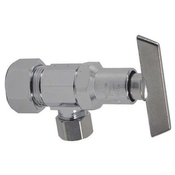 Water Supply Stop, Handle Operation 1/4-Turn, Body Material Brass, Body Finish Chrome-Plated, Connection Size - Side 1 1/2 in, Connection Type - Side 1 Sweat, Connection Size - Side 2 3/8 in, Connection Type - Side 2 Compression, Connection Size - Side 3 Not Applicable, Connection Gender - Side 3 Not Applicable, Connection Type - Side 3 Not Applicable, Maximum Pressure - Operating 200 psi, Operating Temperature - Minimum 33 Degrees F, Operating Temperature - Maximum 100 Degrees F