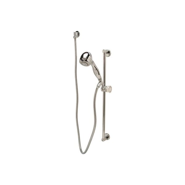 Z7000-hw-h9 - low consumption shower system, 1.5gpm zurn z7000-hw-1.50 hand/wall shower unit consisting of hand held shower head with swivel connection, 60 flexible metal hose, 24 mounting bar wall connection, with supply elbow & flange. Non-adjustable spray pattern, with 1.50 gpm pressure compensating flowrate regulator