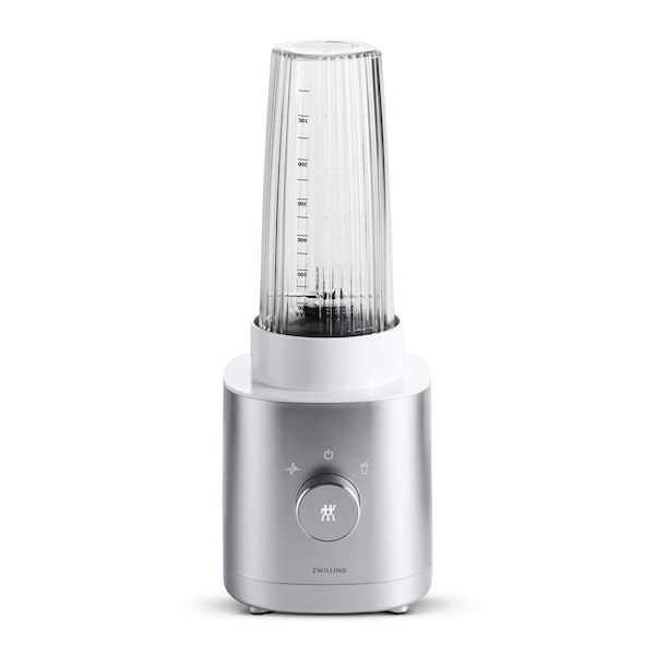ZWILLING Enfinigy is the revolutionary new electrics line that mixes German engineering and innovation with a fresh, sleek design. This gorgeous line combines modern aesthetics with high-performance features and the longest warranties in the industry. Unique to this collection is the accompanying app, which can be downloaded for free from the App Store. Simply scan the QR code on the product packaging to download the ZWILLING Culinary World App to search a database of original recipes. ZWILLING Enfinigy is the revolutionary new electrics line that mixes German engineering and innovation with a fresh, sleek design. This gorgeous line combines modern aesthetics with high-performance features and the longest warranties in the industry. Unique to this collection is the accompanying app, which can be downloaded for free from the App Store. Simply scan the QR code on the product packaging to download the ZWILLING Culinary World App to search a database of original recipes. Give your recipes a boost with the new blender series. These compact, high-watt workhorses easily whip up creamy purees, chunky salsas, and healthy smoothies to go. You’ll get the perfect texture every time, thanks to the sharp blades for which ZWILLING is well-known. This series features the 64 oz capacity Power Blender Pro and Power Blender, along with the 20 oz. capacity Personal Blender. Revolutionary personal blender for shakes and smoothies with a fresh, sleek design; Combines modern aesthetics with high-performance features. This blender for kitchen easily whips up creamy purees, chunky salsas, and healthy smoothies. Compact cross blade on this single-serve blender makes quick work of hard-to-blend ingredients. 2 speed settings; 500 watts. Stainless steel body; BPA-free plastic 20 oz. capacity jar that includes a drinking lid which turns personal blender into a spill-proof to-go container. Dishwasher safe parts/attachments. Measures 6.8''L x 6.8''W x 18.3''H, Weighs 6.8 lbs; Cord measures 31''L. Can be used with Zwilling's free downloadable Culinary World app to search a database of original recipes.