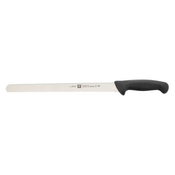Knife, FDA Compliant No, Forged/Stamped Stamped, Knife Type Slicer, Blade Material Stainless Steel, Dishwasher Safe Yes, Handle Color Black, Blade Type Serrated, Overall Length 11 1/2 in, NSF Certified Yes, Handle Material Polypropylene, Blade Length 11 1/2 in, Metal Detectable No, Number of Implements 1, Finger Guard Included Yes