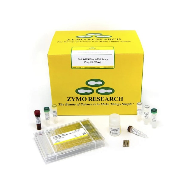 The Quick-16S Plus NGS Library Prep Kit V3-V4, UDI is the fastest and simplest NGS library prep targeting the V3-V4 region of the 16S rRNA gene for high-throughput sequencing. The automation-friendly protocol utilizes a single qPCR/PCR for combined targeted amplification and barcode addition using specially designed primers. After pooling by equal volume, a single clean-up of the final library is performed, rather than massive AMPure bead-based clean-ups. Additional library quantification analysis such as TapeStation analysis or gel electrophoresis are not necessary. With these features, the workflow dramatically reduces the hands-on time of library preparation to only 30 minutes.The most streamlined NGS kit with only 30 minutes of hands-on time for 96 samples.100% automation ready with only a single PCR step and without the need for normalization.Real-time PCR enables absolute microbial copy number quantification.16S V3-V4 Primer Sequences adapters not included: 341f CCTACGGGDGGCWGCAG, CCTAYGGGGYGCWGCAG, 17 bp and 806r GACTACNVGGGTMTCTAATCC, 24 bp. The forward primer 341f is a mixture of the two sequences listed.Amplicon Size: The final amplicon size after 1-Step PCR targeted amplification and barcode addition is 606 bp.Barcode Sequences: Barcode Sequences: 10 bp barcodes, Available for download here.Index Primers: Unique dual index barcodes to label individual samples.Primer Coverage: bacteria 84.2%, archaea 75.8%, and eukaryota 0.0%.Required Equipment: Microcentrifuge, plate spinner centrifuge, 96-well real-time quantitative PCR system SYBR Green compatible or standard PCR system, and 96-well real-time PCR plates.Sample Input: Purified microbial DNA 100 ng, free of PCR inhibitors.Sequencing Platform: Illumina MiSeq without the need to add custom sequencing primers. Zymo Research recommends the MiSeq Reagent Kit v3 600-cycle. For assistance with sample sheet setup, see Appendix F.Shipping Weight: 0.0626 lbsResearch or further manufacturing use only, not for food or drug use.